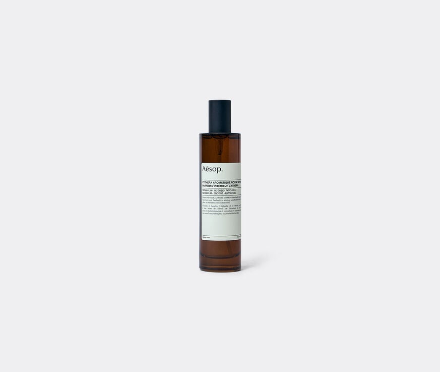Aesop's 'Cythera Aromatique' room spray blends geranium, incense, myrrh and patchouli in a woody, hypnotic accord. Characteristic of the fragrance atelier's signature style, the scent is deep, clean, and nuanced. An ode to the Greek island of Cythera — birthplace of Aphrodite — the spray infuses spaces with a warm and sensuous accord. The 100ml amber glass bottle encapsulates the brand's unmistakable minimalist aesthetic. Products are aluminum-free, cruelty-free, and vegan.