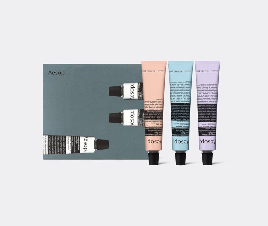 A trilogy of beloved balms, the 'Helping Hands Trio' includes Aesop's favorite moisturizing creams in one indispensable hand care kit. Featuring long-lasting hydration and a greaseless finish, each balm in this set of three reveals its own lingering aroma. 'Resurrection' blends mandarin, rosemary and cedar in a fresh, spa-like fragrance. 'Reverence' combines bergamot, vetiver, and petitgrain, while 'Eleos' unites patchouli, cedar and clove in clean, resinous accord. Each balm comes in its own colored tube, capturing the brand's iconic minimalist aesthetic in pink, lilac and blue. Formulas are aluminium-free, cruelty-free, and vegan.