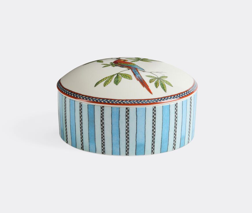 Lisa Corti’s collectable porcelain is adored for its bold, distinctive aesthetic and fine craftsmanship. This jewelry box is part of the 'Jungle Parrot' collection, which brings together exotic scenes and textile-inspired surface design. The circular box features a fine illustration of a parrot amid the trees on its lid, while the container itself is encircled with a geometric vertical stripe in shades of blue. A red edge and navy herringbone detailing add contrast and dimension, characteristic of the Italian brand. Whether used for jewelry, trinkets, or other small and precious items, this practical storage piece adds a warm and elegant touch to spaces throughout the home. Dishwasher safe.