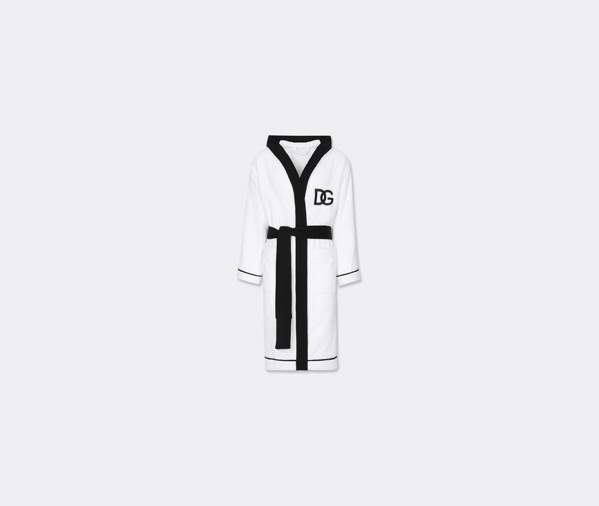 This statement bathrobe by Dolce&Gabbana Casa is made from 100% plush terry cotton for opulent lounging. The elegant monochrome design features the D&G logo finely embroidered in black on white. A black sash and front edges complete the piece, along with contrast detailing on the cuffs and trim. This decadent addition to homes blends the expressive philosophy of the Italian design house with unparalleled comfort and quality. The hooded bathrobe can be worn with slippers from the collection for the complete look.