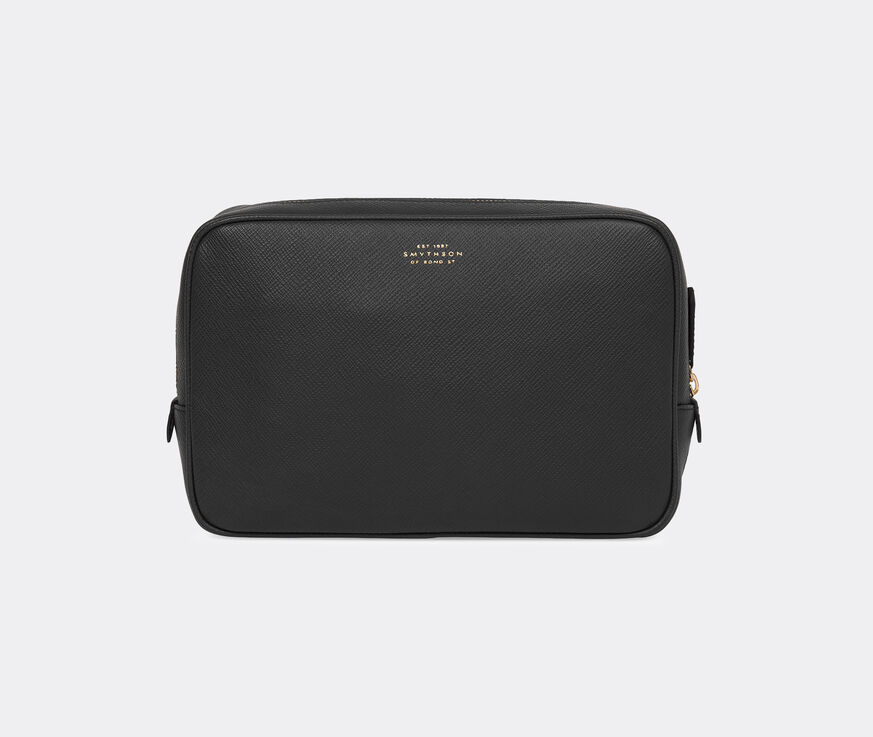 Smythson's timeless craftsmanship is realized in the 'Panama' organizer tech pouch, for the effortless carrying of tech essentials en-route. Crafted in the brand's signature crossgrain black calf leather, and subtly printed with the Smythson motif in gold, this sophisticated design is sympathetically sized to sit inside a suitcase or overnight bag. A variety of zip and slip pockets keep charging cables, tech items and accessories perfectly in place. This luxury tech pouch is lined with high quality fabric and is made in England.
