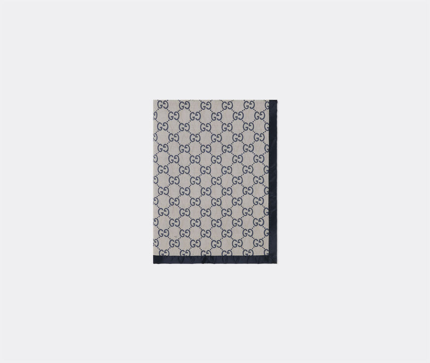 Gucci's famous 'GG' logo is supersized and applied to this large quilt for a dramatic interior accent. Woven from a cotton and polyester mix, the beige and blue throw features a quilted texture on one side and a navy satin trim, while the 'GG' logo appears in a different size on each surface for the option of a slightly different display when flipped over.