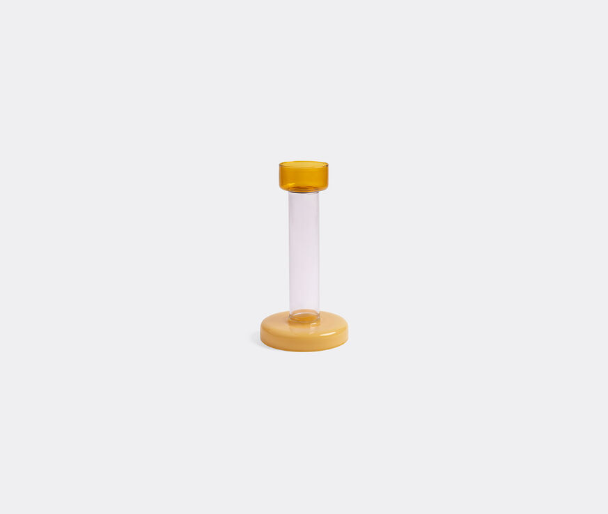 Each object in the 'Bole' collection is imagined by Dutch designer Lex Pott as part of a landscape of pieces of different sizes, colors, and layers of transparency. The series of candle- and tealight holders — crafted entirely from borosilicate glass — includes medium this amber and yellow candleholder, composed of an opaque base in yellow, a clear candlestick, and a tealight cup in transparent amber. Realized in collaboration with &k Amsterdam, under sublabel Buro Berger, objects are designed to be mixed and matched.