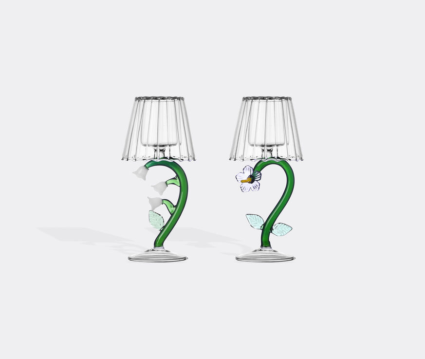 This set of two multicolor tealights is made entirely from borosilicate glass, and topped with finely ribbed hats to disperse soft, sparking light around rooms. Alessandra Baldereschi’s 'Botanica' series for Ichendorf Milano sees glass stems sprout verdant leaves, buds and blooms. Animated by spring flowers on curved stems, these slim, enchanting pieces, with silhouettes that recall drinking glasses, blend beautifully into table set ups, creating instant charm and atmosphere.