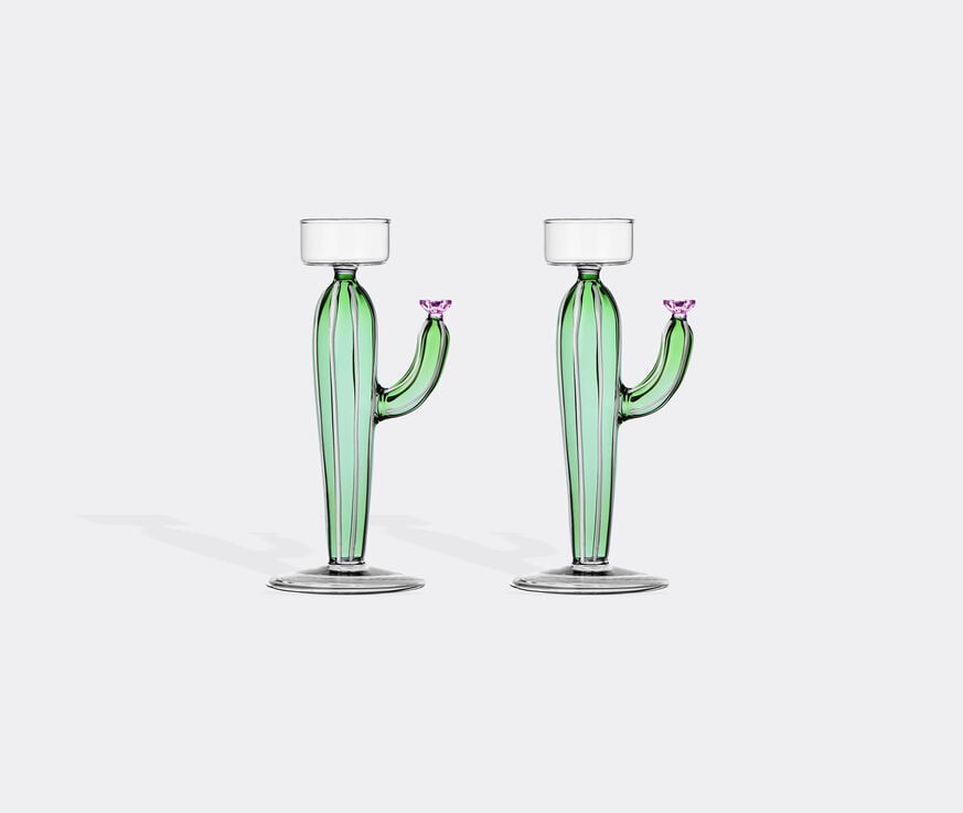 The 'Desert Plants' tealight for Ichendorf Milano joins a family of cactus plants rendered in borosilicate glass. Lampworked and handcrafted, these statement succulents by Alessandra Baldereschi are an invigorating addition to tables. Featuring fine white stripes on a tapering green base, and a decorative arm finished with a pink flower, this set of two tealights can be blended with glassware from the same collection for a spectacular look.