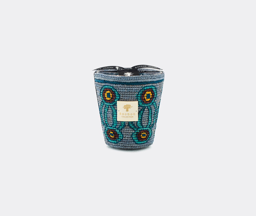 The refreshing, deep and salty scent of the 'Doany Ikaloy' candle is redolent of Madagascan coasts, and the sea. Named after the sacred hill of the island's first king, the 'Ikaloy' candle blends the green, refreshing aroma of vetiver with the fragrance of salt flowers on a warming base of amber for a profoundly vivifying aromatic experience. This luxury candle for Baobab Collection reflects the marine world in its decoration. Covered in hand-crocheted raffia from a women’s cooperative in Madagascar, the design of this medium sized 2.3 kg candle — which burns for 150 hours — appears in shades of blue. An aboriginal motif representing sacred sites is respectfully repeated all around the candle to graphic effect.