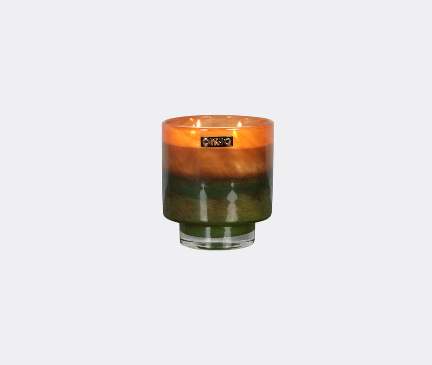 Hand-poured in Belgium, luxury scented candles by ONNO Collection infuse interiors with deeply sensuous fragrances. The medium 32.5kg 'Jane' candle — which burns for up to 150 hours — blends clean top notes of citrus with a floral heart of Tahitian gardenia and tuberose. Cedarwood, vanilla and white musk bring a sweet, balsamic earthiness to the hypnotic 'Sunset' scent. The glass vessel, embossed with the brand name, sees sand-like layers of multicolor green and orange run one into one another, recalling the sand and tide at night.