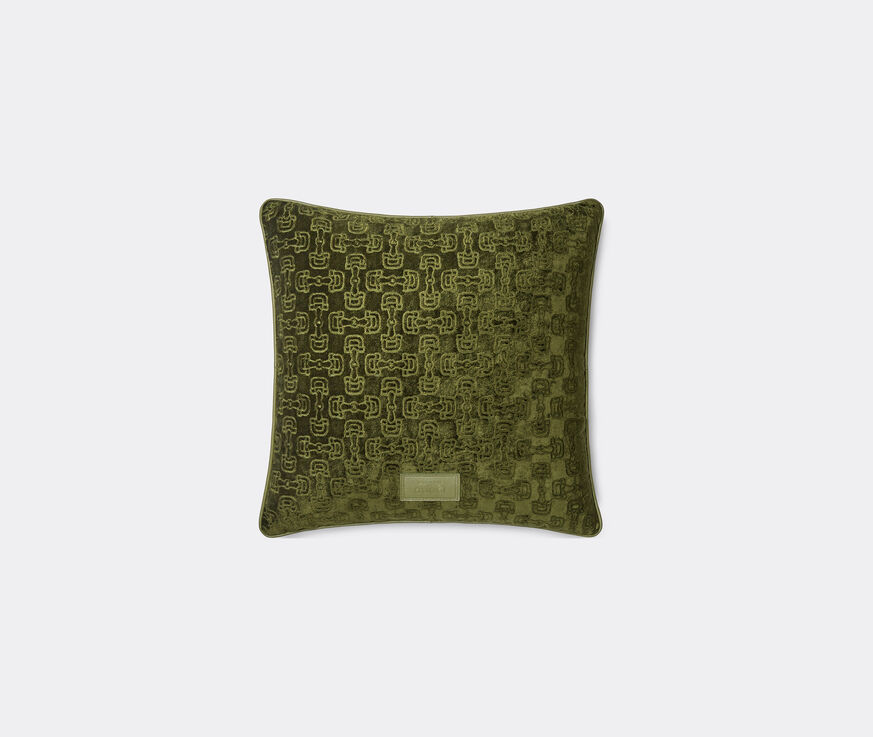 Gucci's famous 'Horsebit' hardware is reinterpreted through a contemporary lens on this cushion created for Cruise 2024. Here, the interlocked buckle is reinterpreted as a jacquard pattern across this bottle green cushion, which is finished with plain green leather back and Gucci label for a simple yet poignant interior accent that speaks to the brand's heritage.