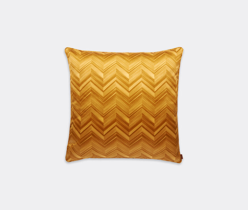 An elegant combination of cotton sateen and Missoni's signature chevron motif, the 'Layers Inlay' collection makes for a series of memorable interior accents. This large square cushion bears the series' hallmark of a faded chevron pattern in gold, which is placed alongside a logo label for an interior presence that is subtle and yet unmistakably Missoni. The cushion is suited to a variety of environments in the home and can be displayed alone or as part of an ensemble with other colors from the collection.