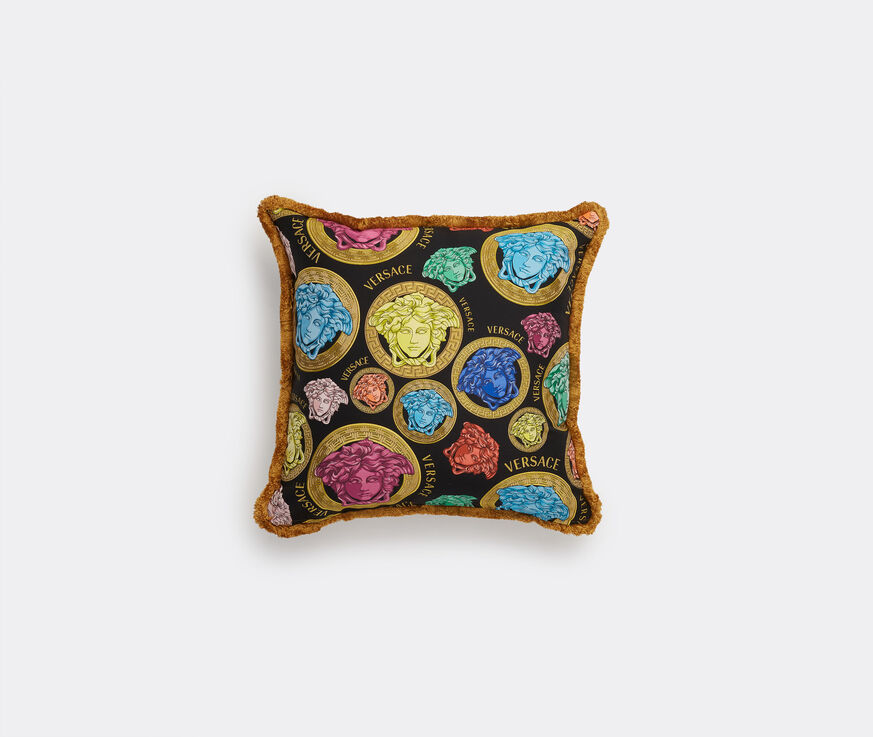 Marrying Versace's 'Medusa Amplified' print with fringed trims, this cushion introduces some of the Italian house's main motifs into the home. Crafted from plush black cotton that is adorned with a Medusa head pattern in gold, the cushion is equally suited to living spaces and bedrooms.