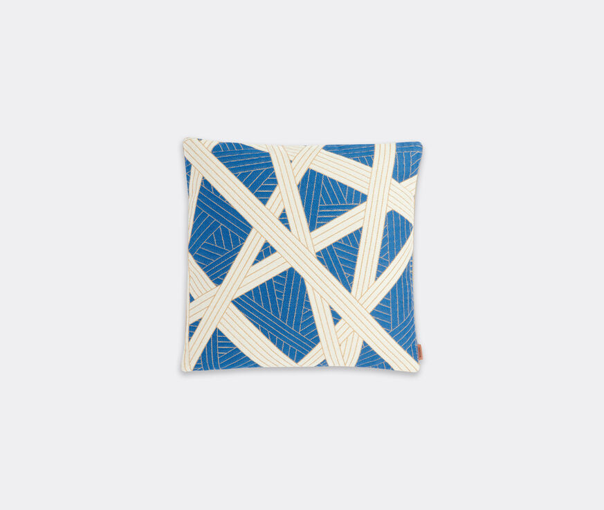 Characterized by the interweaving of linear bands in contrasting colors, Missoni's 'Nastri' motif stands out for its illusion of depth and a contemporary guise. On this small cushion it's applied to great effect, with strips of deep blue and white combined with gold stitching, tubular piping and a logo label for an elegant cushion that is suited to a multitude of contemporary and traditional interior styles.