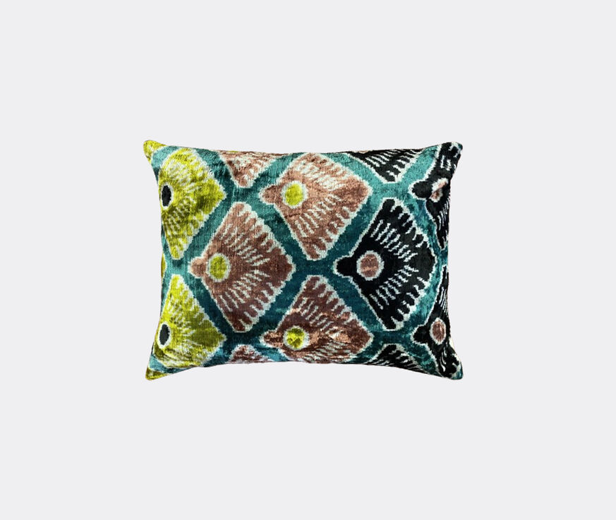 Set against a rich aquamarine blue, the lively dance of geometric fans in this velvet cushion by Les-Ottomans’ adds a refined retro glamor to interior spaces. Accents of tan and chartreuse, dramatized by black, are woven in a mix of velvet, silk and cotton in this rectangular multicolor design, which can be arranged alongside other pieces from the brand's wide collection for an exhilarating display.