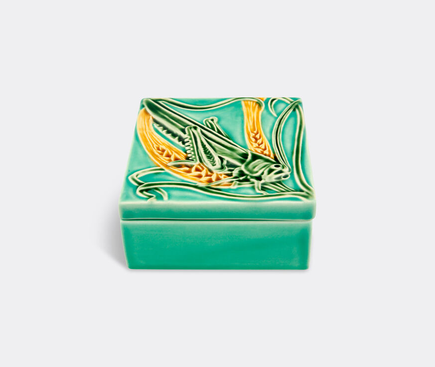 Bringing together a naturalism inspired by Raphael Bordallo Pinheiro with an Art Nouveau inspiration, the 'Azulejo Box' series presents a collection of decorative ceramic containers. Topped with a lid embellished with an image of a grasshopper, the striking box is finished with a manually applied glaze and as such features its own unique characteristics.