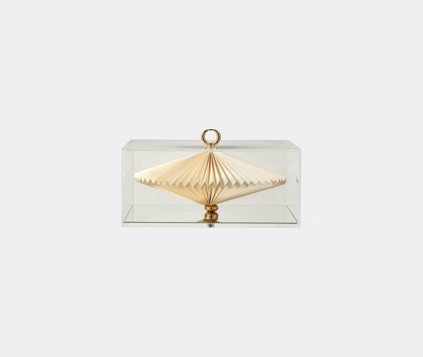 Brazilian mother-daughter brand By Gabs brings together a unique, characterful collection of decorative sculptures for interiors. With the aim of adding soul, spirit and passion to spaces, their attention-grabbing pieces exude personality and instantly elevate rooms. Working with a women's cooperative, the duo presents inimitable sculptural arrangements in paper that play with space and form. 'Double Round Joia' is at the intersection of origami and jewelry. The piece sees two sculptural paper cones come together in a striking geometric form. Gracefully positioned inside an acrylic box, the piece stands poised, evocative of a spinning top, as if by magic. The use of golden decorative detailing — including the ring that playfully emerges from the box — juxtaposes with the fineness of the paper, and creates instant glamor that epitomizes the brand. This delicate yet commanding statement sculpture comes together in an elegant shade of off-white.