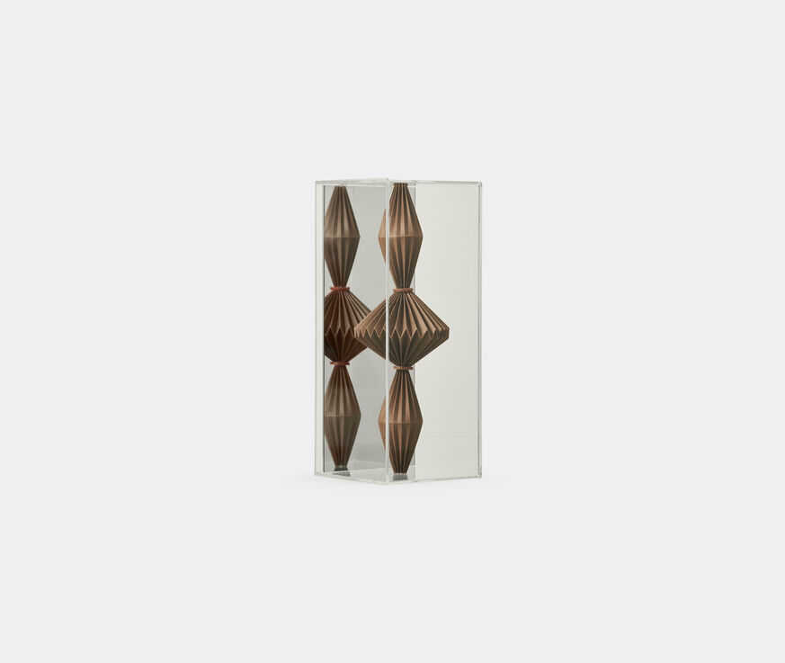 Brazilian mother-daughter brand By Gabs brings together a unique, characterful collection of decorative sculptures for interiors. With the aim of adding soul, spirit and passion to spaces, their attention-grabbing pieces exude personality and instantly elevate rooms. Working with a women's cooperative, the duo presents inimitable sculptural arrangements in paper that play with space and form. 'Double Triballoon Joia' is at the intersection of origami and jewelry. Exploring the air element and its relationship to lightness and creativity, the sculpture, which appears to be suspended inside an acrylic box, connects three geometric origami pieces with two golden rings. This delicate yet commanding statement is presented in a rich, chocolate brown.