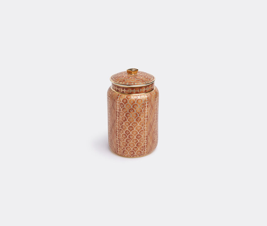 Inspired by the artisans of Venice, L'Objet's Elad Yifrach has created the 'L'Objet pour Fortuny' collection, a series of earthenware dinnerware featuring the patterns of fashion and textile designer Mariano Fortuny. This large orange canister is characterised by hand-gilded 24 karat gold accents, which adorn its entire body and lid. The result is a home accessory that is a vibrant celebration of pattern, shape and colour, and one that will transcend time.