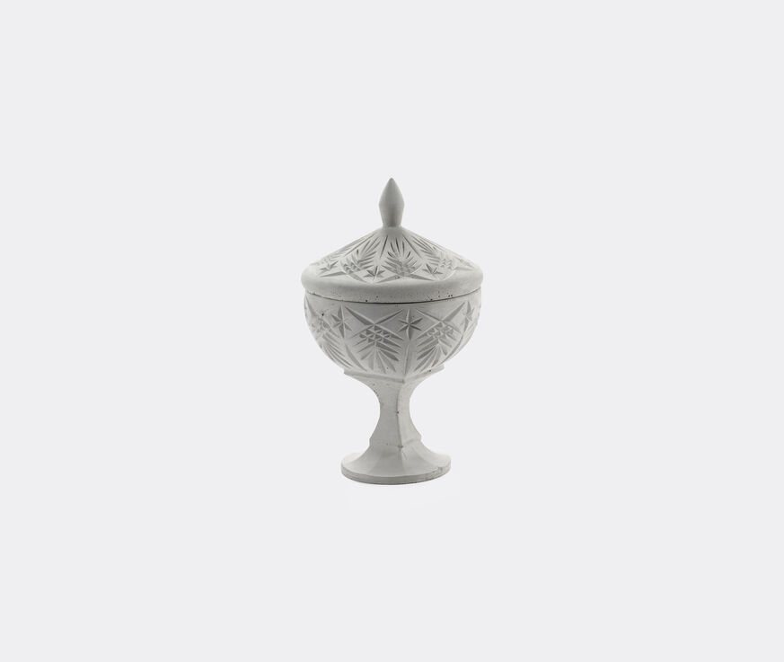 The 'Josephine' bonbonniere is a tribute to fashion designer Kris Van Assche's beloved grandmother. The design juxtaposes the raw, industrial quality of concrete with delicate detailing and a graceful silhouette. This tall, elegant piece in natural gray features impressions that mimic diamond cuts in vintage crystal trinket dishes. Elegant and surprising, this charming object by Serax can be used to store small precious items of jewelry.