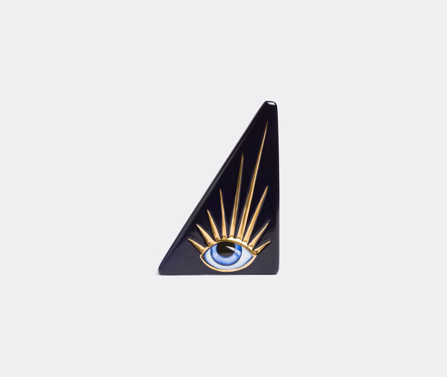 For centuries, the eye has acted as a popular talisman, with its symbolism rooted in a belief of its power to ward off negativity, protect, heighten awareness and encourage owners to seek beauty in the world around them. Designed by Elad Yifrach for L'Objet, the 'Lito' bookend introduces this respected symbol to the home or office in a surreal, yet elegant fashion. Crafted from black painted Limoges porcelain, the triangular bookend features a large eye on its side and is accented with 24-karat gold plated detailing.