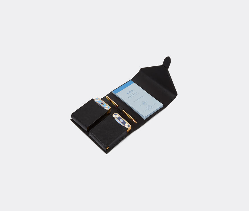 Housed inside an elegant travel case lie two sets of playing cards for old-fashioned entertainment on the go. It's all crafted by British brand Smythson, whose signature use of cross grain leather in black is shaped into a portable case that is ideally sized for packing into a suitcase or bag, and lined with smooth calf leather. Accompanied by a small Smythson-branded notebook and a gilt pencil for score keeping, the double set of gilt-edged card — one set in navy and one set in Nile Blue — is neatly secured with a leather tab for a chic and compact travel companion.