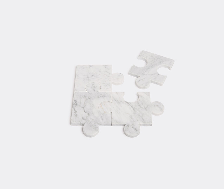 An adults-only puzzle. Stone cut from high quality white marble, Karol Droszcz's set of four coasters are at once playful and practical. Produced by Tre Products, the quartet may be joined together to create a trivet upon which to place hot dishes.