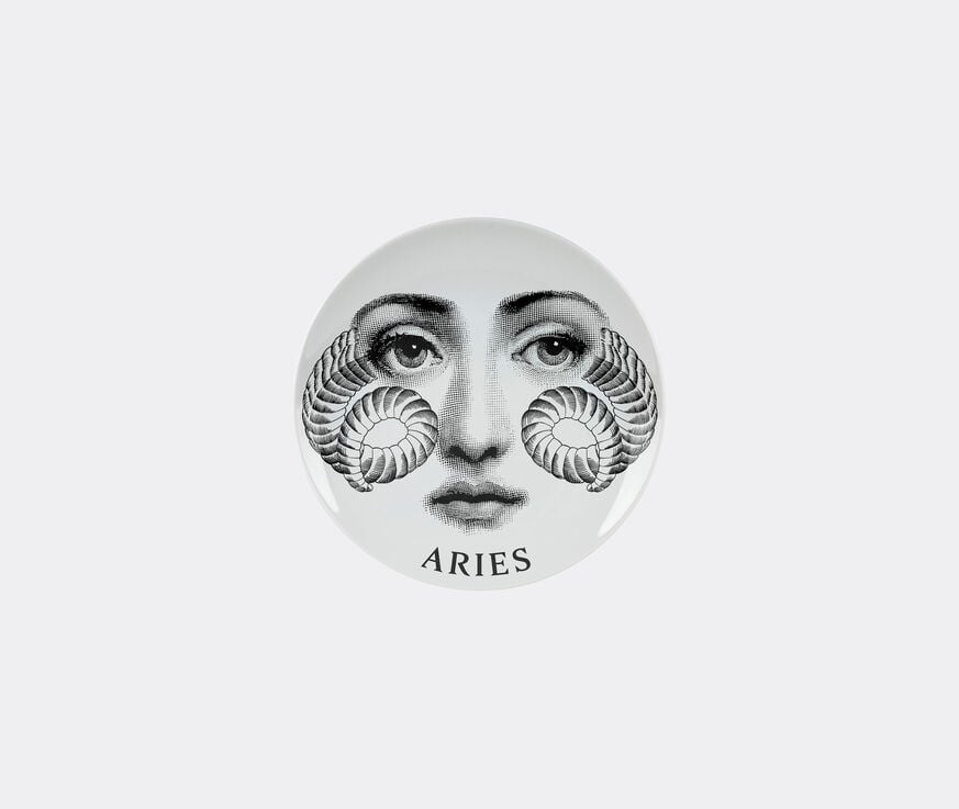The stylized face of opera singer Lina Cavalieri is infinitely reimagined across collectible objects in Fornasetti’s 'Tema e Variazioni' series. The Zodiac collection features a family of wall plates dedicated to the signs of the Zodiac. Each plate illustrates the astrological sign in true Fornasetti style, with the name of each sign appearing on the piece. The 'Tema e Varazione N.348, Aries' plate sees ram horns, associated with the constellation, curl playfully over Cavalieri’s face, held in a neutral expression. This hand-decorated, black and white monochrome wall plate is designed to be suspended, via two holes on the reverse, or used ornamentally in striking table set ups. Owing to artisanal craftsmanship, plates may reveal minor distinctions, making each piece unique.