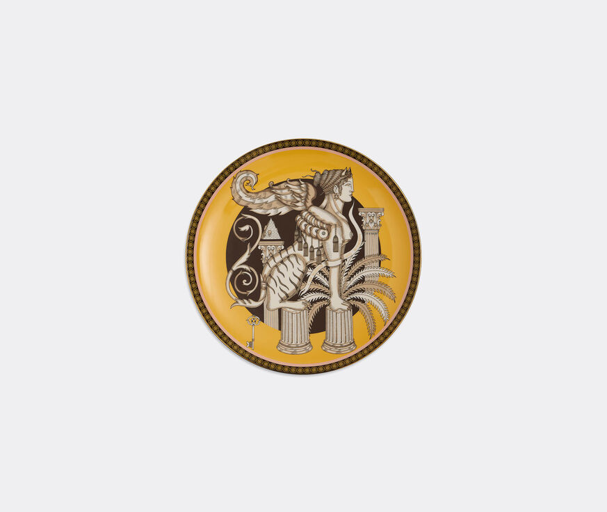 This decorative etched plate by La DoubleJ features a stylized, sideways-facing Sphynx sitting on two pillars. A palm and a key complete the scene. The design comes together in shades of beige, brown and white on a rich saffron background with 18k gold detailing. Crafted in collaboration with Turin-based artist Elisa Seitzinger, this intricately hand-drawn piece is part of a collectable series. The Guardian Collection includes five supernatural subjects designed to protect the energy of the owner. A ribbon woven into the design reads: "I am wisdom and authority". Whether used in dining or simply displayed, solo or as a set — 'The Sphynx' is an enigmatic object that brings a stylish sense of the otherworldly to spaces.