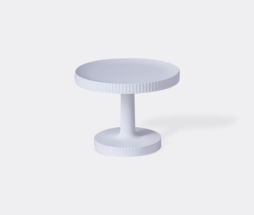 This portable lamp by Italian brand Driade uniquely offers both direct light, and a surface on which to place and keep things. With its table-like appearance, Welcome in white is a sleek and multifunctional addition to spaces. Designed for in- and outdoor use, this clean and soothing luminary, with its downward glow, reflects the surprising objects that typify the experimental Italian design studio. Playing with contrast and texture, the piece is composed of a circular base and top with ribbed edges and detailing. Elegant and minimalist, the lamp features integrated LED.