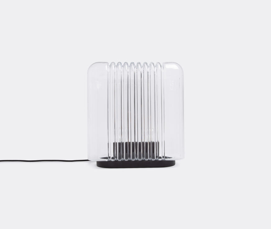 Designed by Angelo Mangiarotti in 1978, the 'Lari Lamp' is evocative of the Italian designer's architectural masterpieces. Two simple forms crafted from mouth-blown glass create the lamp's shade and sit atop a black lacquered base. The lamp comes with a two metre-long cord which features a dimmer and is suitable for EU plugs.