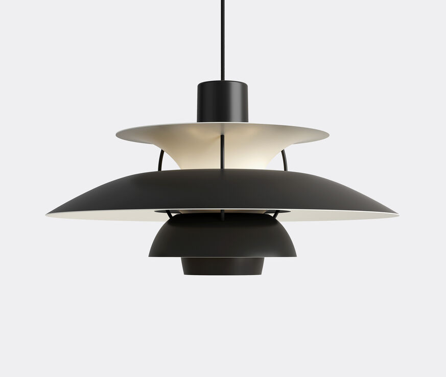 Defined by metal shades, the 'PH 5' pendant lamp recalls the mid-century modern revival of geometric shapes. A development of the original 1958 design by Poul Henningsen for Louis Poulsen, the design can be traced further back to 1925 when the innovative three-shade system — based on a logarithmic spiral — won gold at exhibition in Paris. Radiating hushed, even light from its center, undisturbed by glare or shadow, this sculptural statement, shown here in monochrome black, injects a clean retro feel to any space. Supplied with a US plug. The bulb is not included.