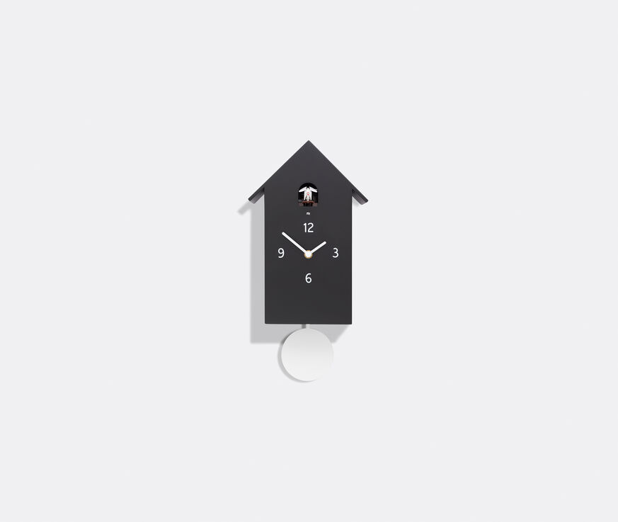 Italian clockmaker Domeniconi puts an innovative spin on the cuckoo clock in 'Zuba'. Combining extraordinary craftsmanship with a clean, modern aesthetic, this fresh interpretation of a traditional object manifests in the shape of a simple house cut from sheet metal. The black design features a red cuckoo, which emerges on the hour and flaps its wings as it sings. Black hands and a black pendulum complete this minimalist yet playful piece. Designed to not disturb sleep, 'Zuba' is equipped with a sensor, which releases the bird only in the presence of light.