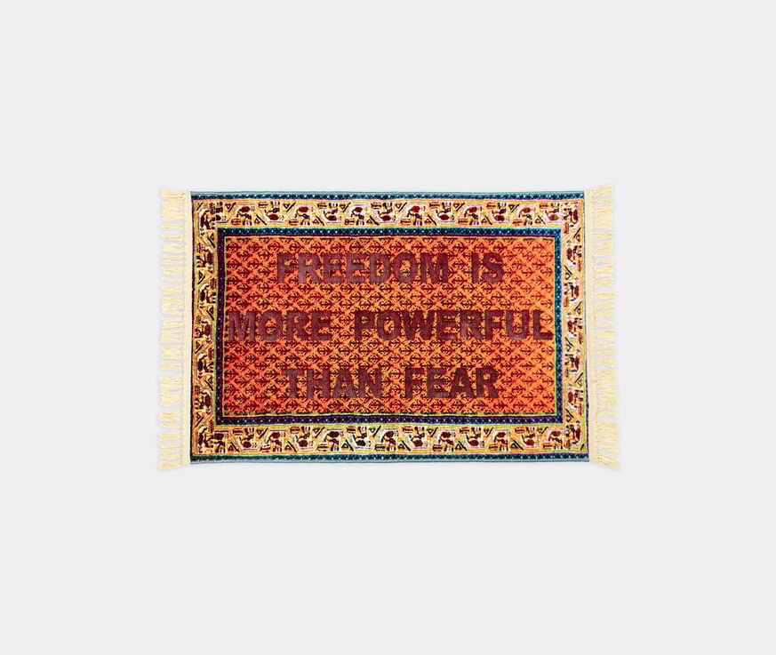 Deemed a sacred space for Eastern populations and symbol of luxury and prestige in the West, the carpet is a combined point of creativity and conceptual depth. Designer Loredana Longo explores this idea further in the 'Burnt Carpet' series for Seletti, where phrases from world leaders of the past and present are seared into the surface using heat and fire. On the multicolored 'Burnt Carpet, Freedom', a quote from Barack Obama — 'Freedom is more powerful than fear' — is emblazoned across the surface for a lasting impact and moment of reflection.