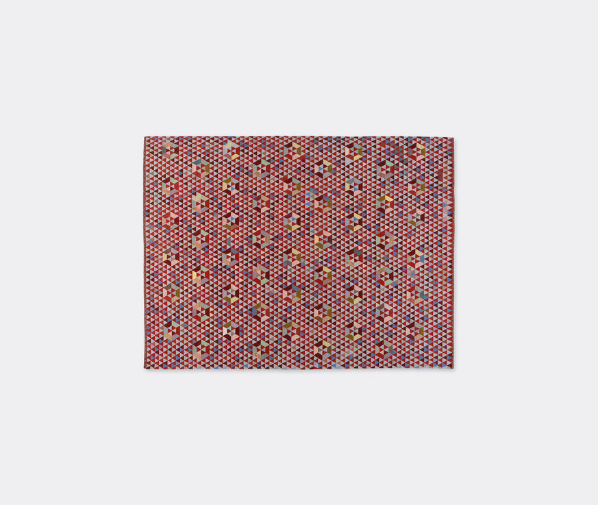 From Bertjan Pot's 'Triangles' collection for Golran, this hand-knotted wool and silk carpet is one of four different models made with the kilim technique. Like all pieces from the line, the carpet's pattern is based on the geometric form of the triangle, which here has been positioned to create a kaleidoscopic series of diamonds and hexagons, emphasised by a clever arrangement of both contrasting and harmonising hues of pinks and reds.
