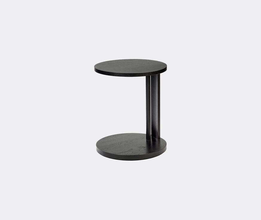 Ann Demeulemeester's 'Aura' side table for Serax possesses a timeless retro feel. Two circles are connected on one side by two parallel columns in a geometric design crafted from solid black oak. An integrated, circular LED light illuminates objects placed on the table, as if from within. The light can be dimmed by lightly touchly the sensor located in the cylindrical column. Using the light, the table becomes a pedestal for showcasing objects of beauty. 'Aura' can stand boldly alone, or feature as an impressive pair.