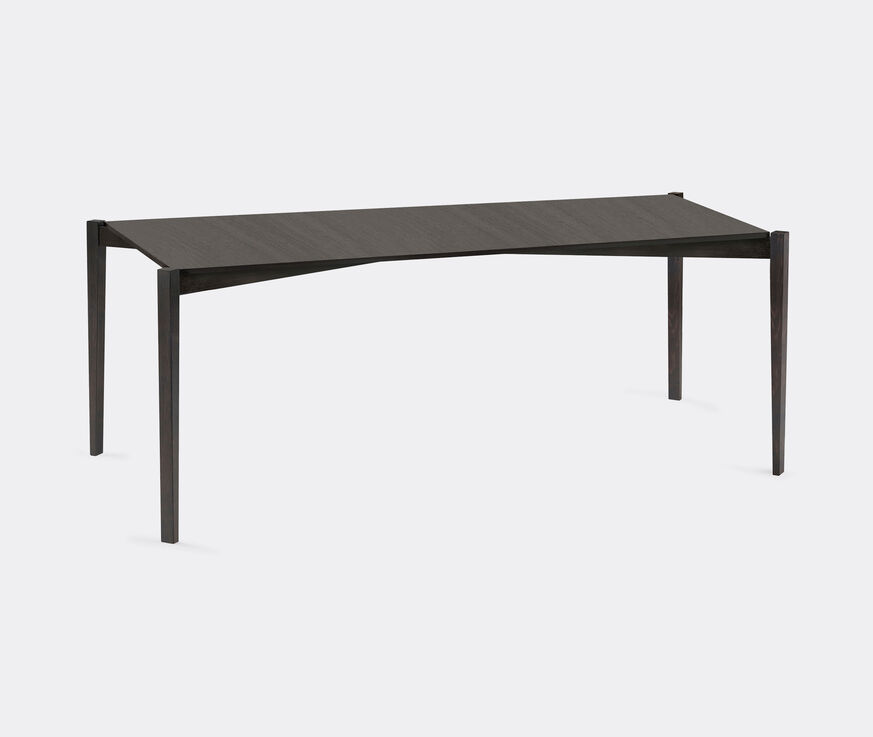 Ann Demeulemeester's rectangular 'Éloïs' table for Serax blends practical space-saving with aesthetic beauty. Tapered legs and visible architecture come together in a stackable wooden design with a distinctly retro feel. Working spaces are elevated by geometric shapes and a smart all-black finish. Tables are designed to be stacked and combined with stools from the same collection.