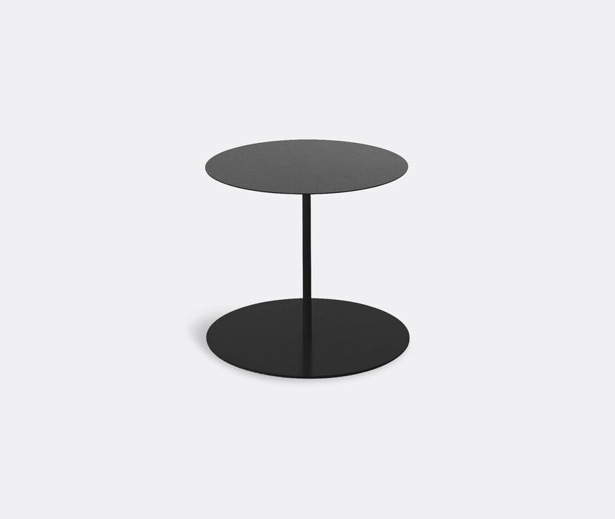 One of designer Giulio Cappellini's signature designs, the 'Gong' table is an elegant classic. Laser-cut from sheet metal, the black matt lacquered table comprises a circular top and base which are connected via a tubular iron leg. The table may be disassembled for ease of storage and transportation.