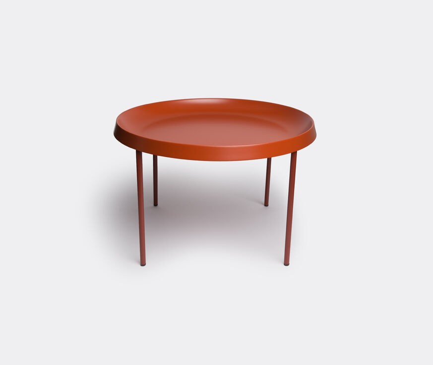 Designed by GamFratesi for Danish brand Hay, the 'Tulou' table combines two simple elements — a circular steel table and a four legged frame — for a sleek contemporary design that offers function and style. Available in a selection of finishes and colours, this version of the table is powder-coated and finished in a shade of rust red.