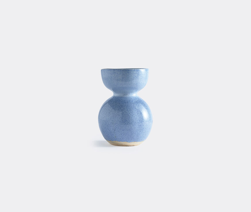 Combining abstract lines with a hand-splattered reactive glaze, Polspotten's 'Boolb' vases offer two versions of spontaneity. This medium-sized version of the vessel presents a light blue background onto which a navy glaze is applied — a pleasing visual contrast that is amplified by a retro silhouette that introduces a clean contemporary edge to the vase. With its flat circular base, the vase is suited to a spectrum of floral blooms and arrangements but is equally alluring when left empty.