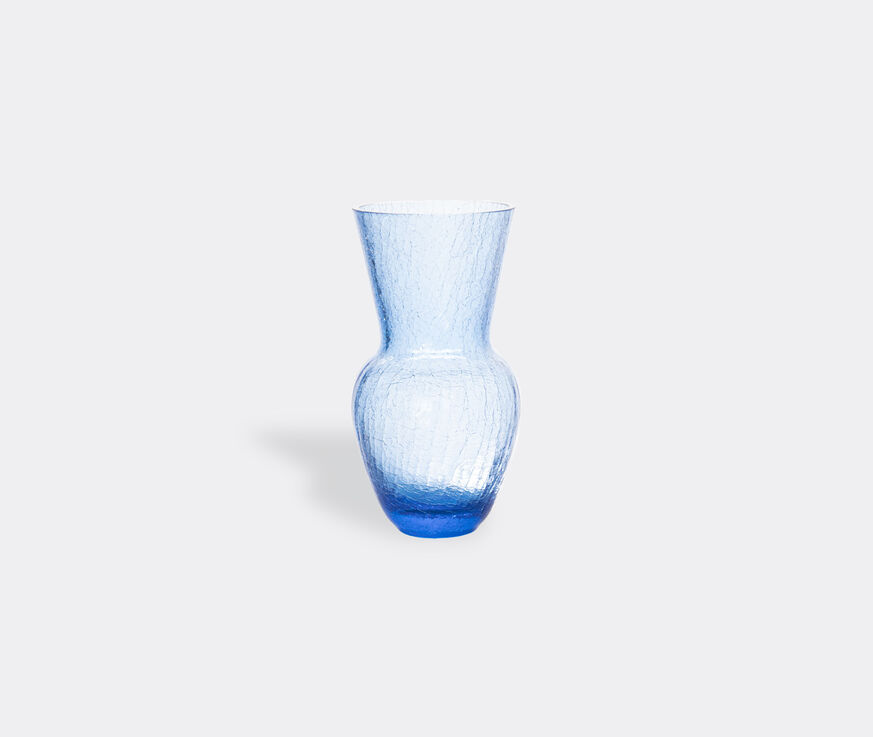 A cool tone of blue and an equally striking silhouette come together in this version of the 'Felicity Vase', which introduces an easy sense of balance and harmony to spaces. Designed by Czech brand Klimchi, the tall vase is defined by flowing lines, which are formed through high quality glass that features a crackle glass effect, for a contemporary item that is equally suited to floral arrangements or empty display. Crafted by Klimchi's artisans with a process where hot hand-blown pieces of glass are brushed through sawdust for the final fragmented effect, this functional glass art piece emits a beautifully vibrant allure, thanks to the pairing of an unmissable shade with a soft and undulating outline.