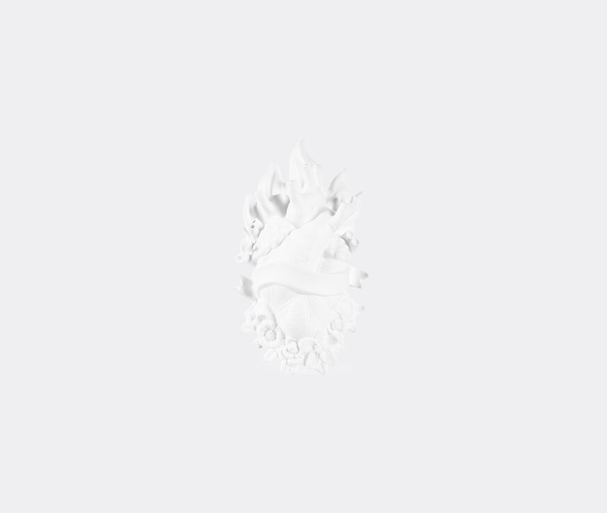 Seletti's original 'Love in Bloom' vase takes on a more passionate expression in this flaming version of Marcantonio's design. Blending the anatomical heart with a sacred heart motif, 'Holy Love in Bloom' is adorned with flowers, flames and tattoo-inspired ribbons in all-white porcelain. This attention-grabbing yet serene statement piece can be uniquely customized. Letter transfers are included for the writing of names, dreams and memories. This playful piece is unexpectedly supported by a frame on the reverse side, placing the vase at a very slight angle. Stems placed into narrow channels ensure chic, contemporary floral displays.