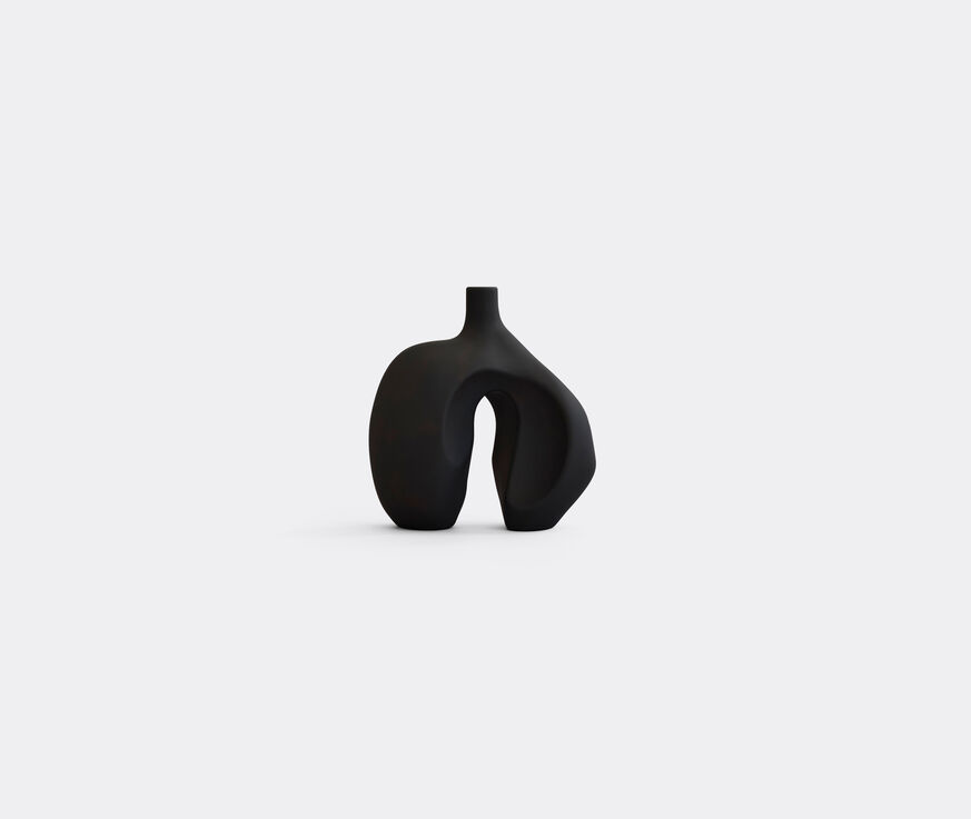 Designers Kristian Sofus Hansen & Tommy Hyldahl capture the essence of movement in the 'Ni' vase. Taking its name from the Japanese word for "motion", the ceramic vessel is built with an organic silhouette that evokes a sense of dynamism and fluidity. Supported by two converging sculptural legs, the design creates a subtle sense of equilibrium and tension. A narrow opening at the top of the vase invites the placement of a single found branch or few delicate stems in minimalist arrangements. Whether displayed as a sculptural statement in its own right, or filled with simple botanicals, the small 'Ni' vase in coffee instills a peaceful energy in spaces.