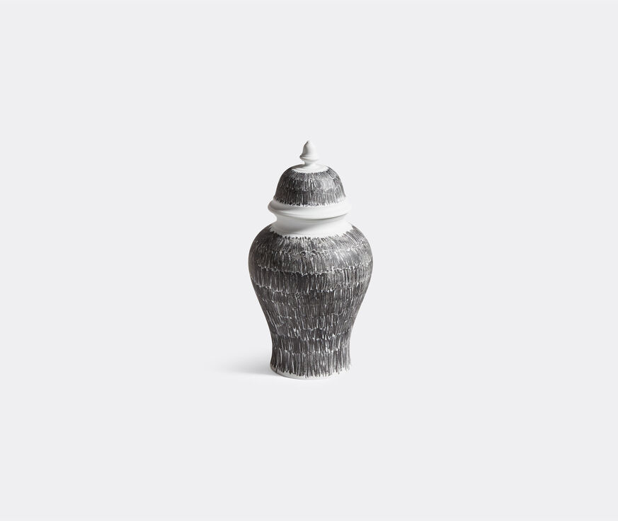 Conceived by research-based design studio Formafantasma for Cassina, the 'Post Scriptum' collection brings together a series of hand-painted porcelain objects. Inspired by silhouettes found in the extensive Ginori Manufactory archives, the designers have applied a contemporary facelift to a family of familiar shapes in the form of graphic 'graffito' decorations. This is achieved through hand drawing each graffito pattern onto bisque porcelain with ceramic chalk crayons and firing the surface to set the pattern. On this curved container, the grafitto pattern takes shape as a series of tightly packed black paint stroke-like flecks for a sporadic but consistent decoration that covers a majority of the exterior and lid.