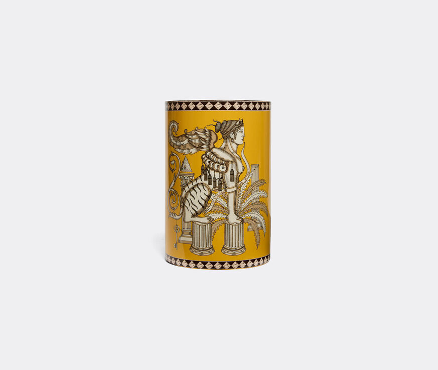 This decorative etched vase by La DoubleJ features a stylized, sideways-facing Sphynx sitting on two pillars. A palm and a key complete the scene. The design comes together in shades of beige, brown and white on a rich saffron background with 18k gold detailing. Crafted in collaboration with Turin-based artist Elisa Seitzinger, this intricately hand-drawn pillar vase is designed to protect the energy of the owner. A ribbon woven into the design reads: "I am wisdom and authority". 'The Sphynx' is an enigmatic vessel, ideal for fresh or dried florals, that brings a touch of the otherworldly to spaces.