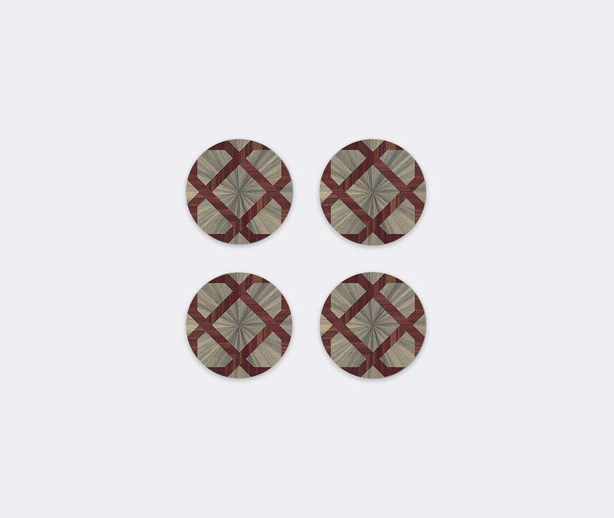 Elevating tableware to the level of fine art, HestiaLiving's collection of coasters, tablemats and trays combines exquisite straw marquetry with striking bespoke patterns. This set of four round coasters is crafted from eucalyptus wood, and features a classic Moorish design inspired by traditional Islamic mashrabiya screens. Combining interlocking geometric shapes, the design comes together in contrasting tones of richly colored prune wood set over a cool radiating background in silver grey. Alluring symmetry and a captivating illusion of depth define the 'Arabesque' (Marrakesh) coaster, which can be blended with other pieces from the collection for extraordinary tablescaping.
