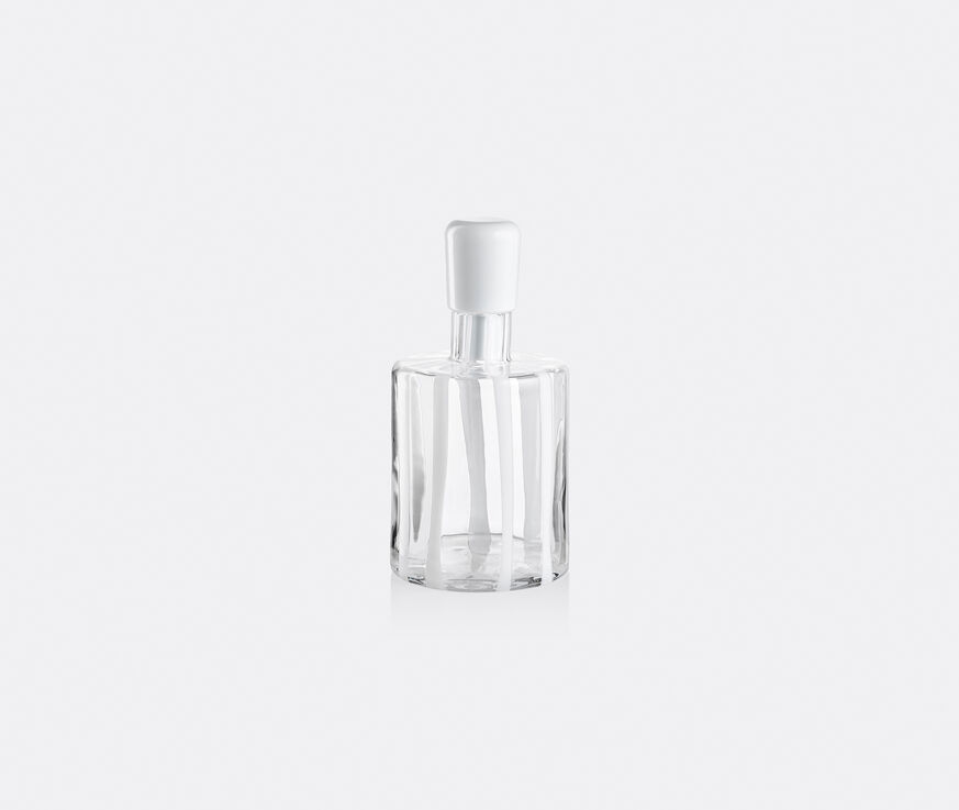NasonMoretti's joyful collection of murano glass vessels celebrates the circus in a troupe of striped designs. Brightening up tables, this otherwise simple and sturdy bottle is dressed with pigmented filaments of color in painterly white stripes. An opaque white stopper, handmolded by the Venetian glass master, completes this design, which creates an atmosphere of stylish spontaneity. The artisanal nature of the piece makes each 'Cyrcus' bottle subtly unique. Mix and match with colored glasses from the series for a spectacular effect.