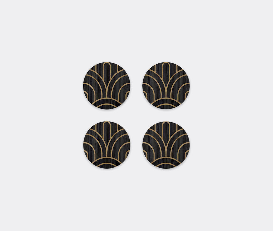 HestiaLiving's 'Deco' line brings a touch of bygone glamor to tables. Creating instant atmosphere, this set of four round coasters encapsulates the exuberance and dynamism of the eponymous arts movement. The coaster features a detailed view of stepped arches in gold, creating hypnotic rhythm against black in a timeless, stand-out design. The 'Deco' (Montparnasse) coaster in noir can be blended with tablemats from the same collection for the full effect.