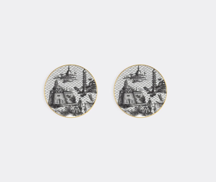 This set of two porcelain coasters by Simone Guidarelli Home features four richly detailed temple scenes in black and white, encircled with hand-finished gold edging. A tessellated patterned background, recalling clouds and bells, brings a graphic, contemporary feel to the design. Part of a series of tableware that renders far flung places in monochrome, the illustration is drawn directly from Guidarelli's maximalist wallpaper portfolio. Inspired by the timeless appeal of Chinoiserie, the 'Oriental Dream' coaster can be mixed and matched with other pieces from the 'Souvenirs De Voyage' collection. Not dishwasher safe.