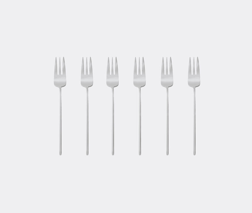Sleek lines and exquisite craftsmanship combine in the '100' cutlery collection by Sambonet. Created in celebration of a century of design, each piece brings the avant-garde curves and angles of late twentieth-century Italian minimalism to tables, reinvigorated with an ultra-modern eye. A study in simplicity, this set of six silver dessert forks, crafted in silver steel, sees slim, extra-long lines meet bold shapes that honor the past and the future.