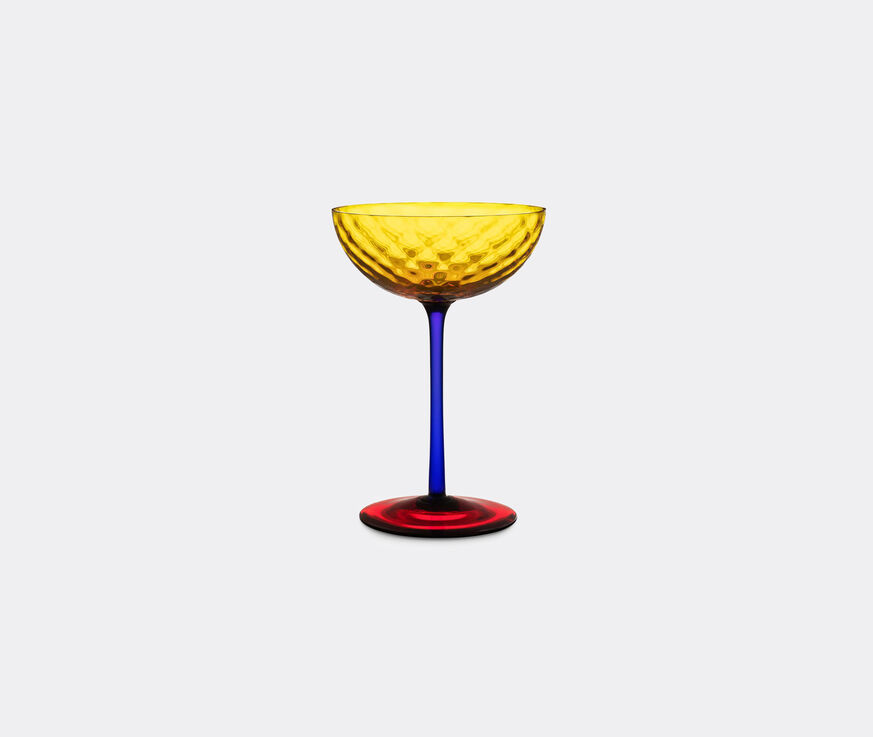 Hand-blown from high quality Venetian Murano glass, Dolce & Gabbana Casa's champagne glass fully encapsulates the brand's ongoing celebration of the 'Carretto Siciliano' and its tether to the island's traditions, craftsmanship and landscapes. Here, it manifests in the use of bright, multicolored tones across a low champagne glass, in which a yellow diamond balloton pattern bowl is paired with a blue stem and a red base for a picturesque chromatic combination that is both animated and elegant.
