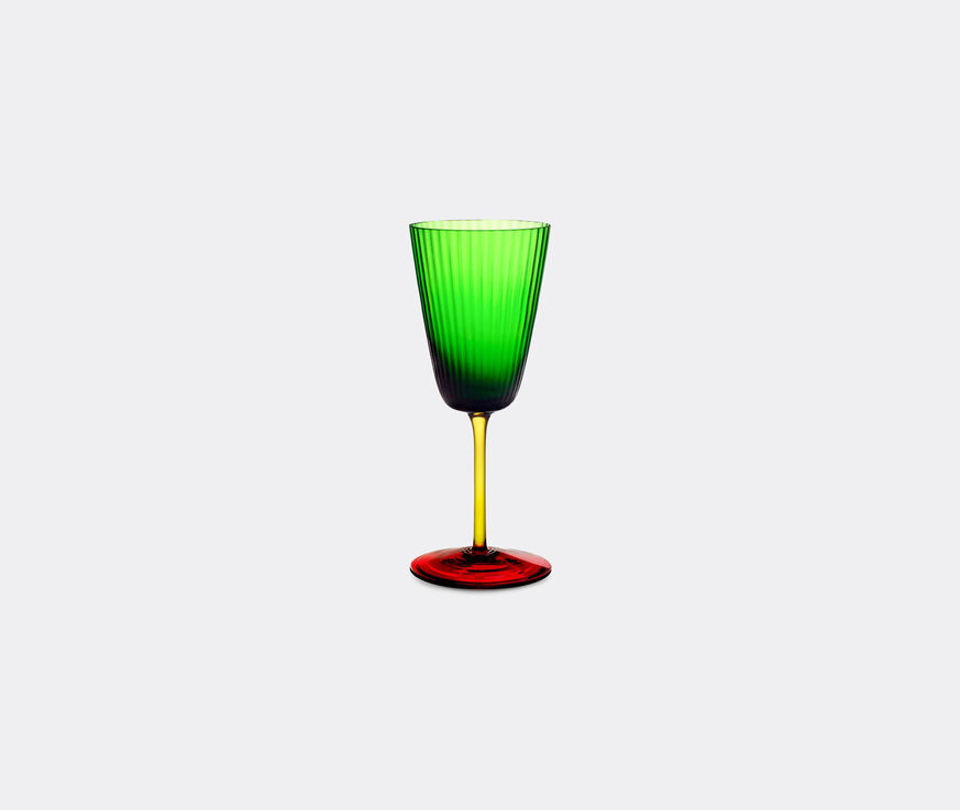 Hand-blown from high quality Venetian Murano glass, Dolce & Gabbana Casa's white wine glass fully encapsulates the brand's ongoing celebration of the 'Carretto Siciliano' and its tether to the island's traditions, craftsmanship and landscapes. Here, it manifests in the application of bright, multicolored tones across this glass, which comprises a green rigadin bowl, a yellow stem and a red base for a picturesque chromatic combination that is both animated and elegant.
