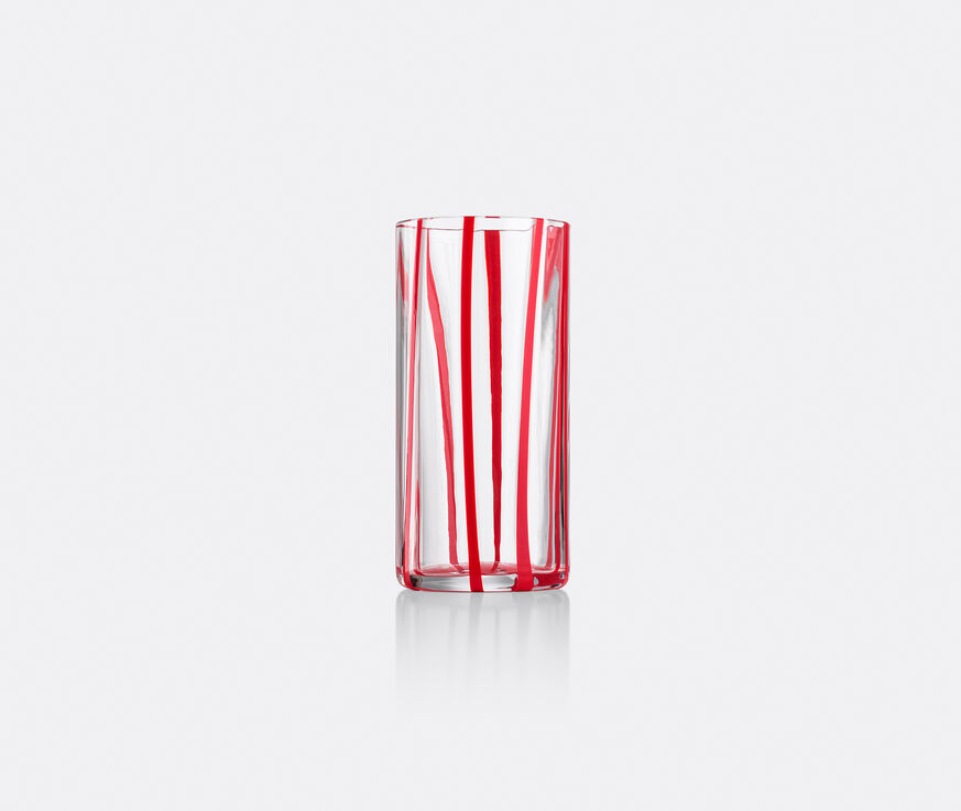 NasonMoretti's joyful collection of murano glass vessels celebrates the circus in a troupe of striped designs. Brightening up tables, this otherwise simple drinking glass is dressed with pigmented filaments of color in painterly coral red stripes. The design, which creates an atmosphere of stylish spontaneity, can be mixed and matched with glassware from the series for a spectacular effect. The artisanal nature of the piece makes each 'Cyrcus' highball glass subtly unique.